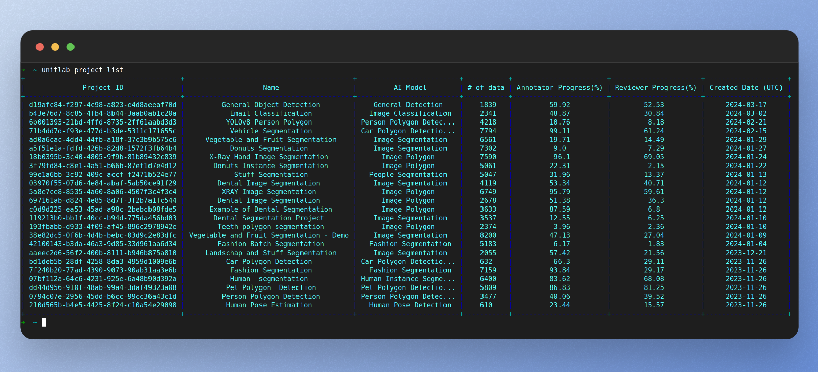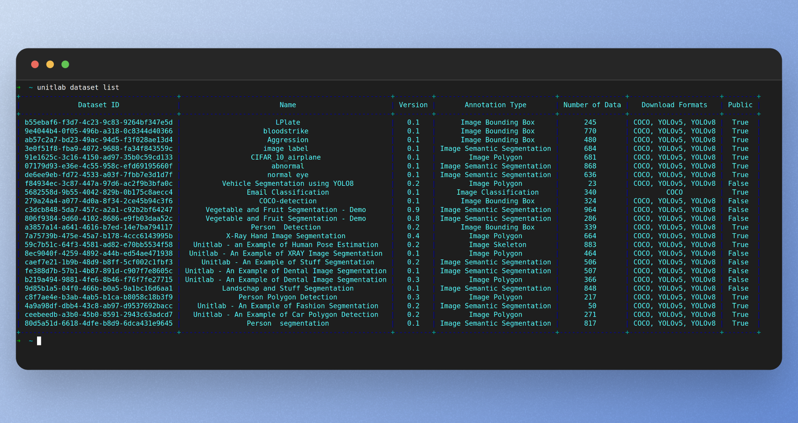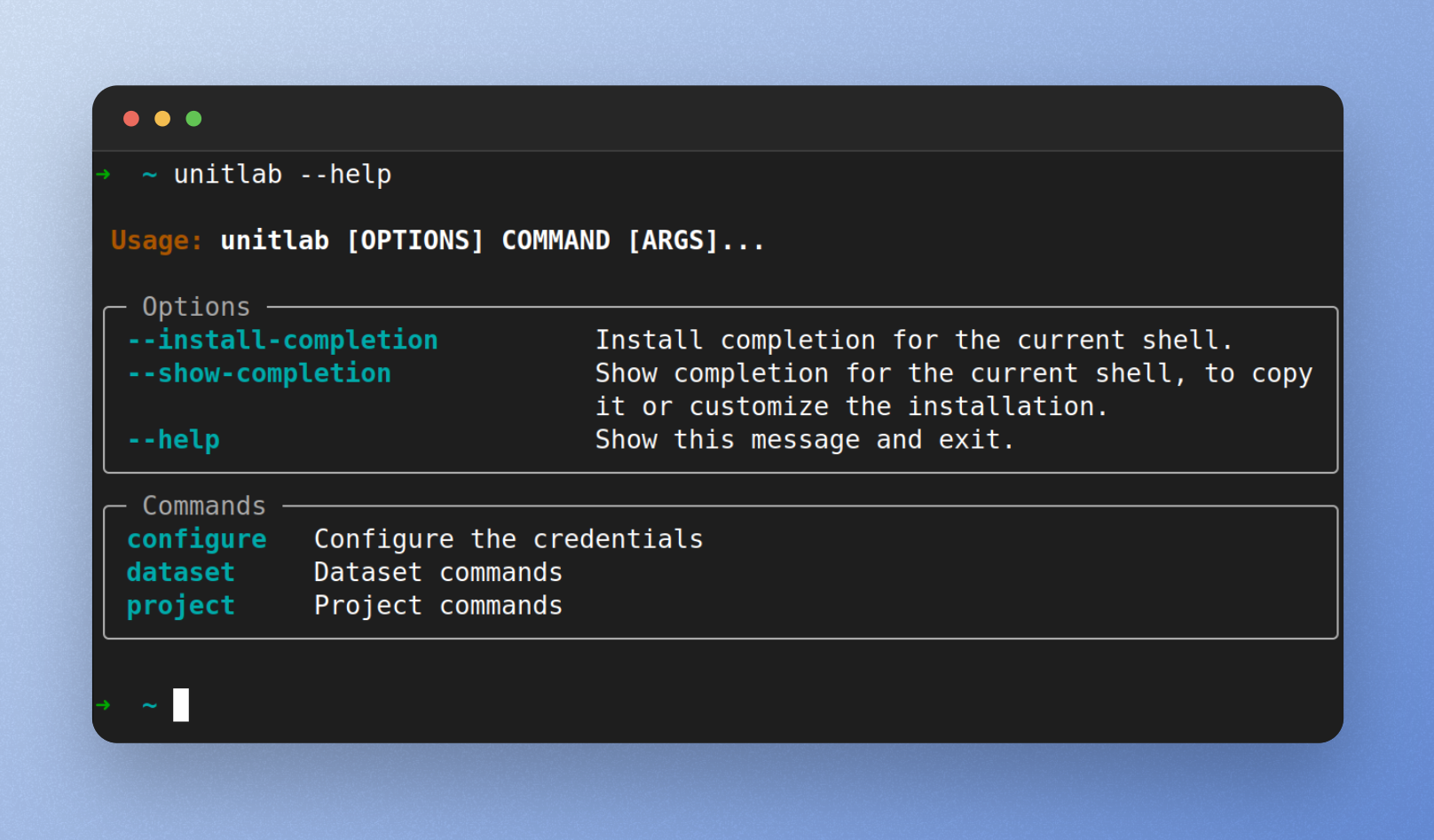 After [installing the Unitlab package](https://docs.unitlab.ai/cli-python-sdk/get-started), you can efficiently manage your projects and datasets through the terminal. To access all the available commands,  run `unitlab --help`. However, before executing any command, ensure you have an API key, which can be obtained by visiting the user account page.