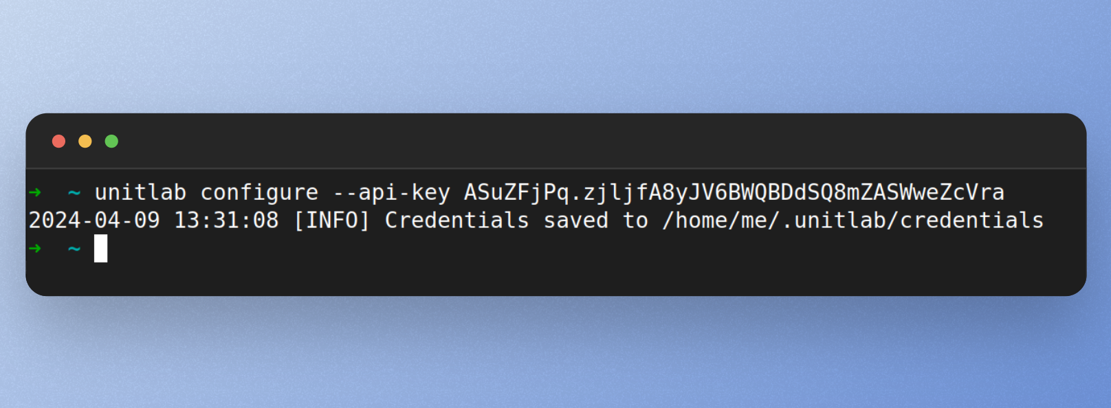 This command helps you configure your credentials. It saves the API key and URL in a configuration file  `~/.unitlab/credentials`for future use. Other commands can override the default API key if provided as an `--api-key`option.&#x20;